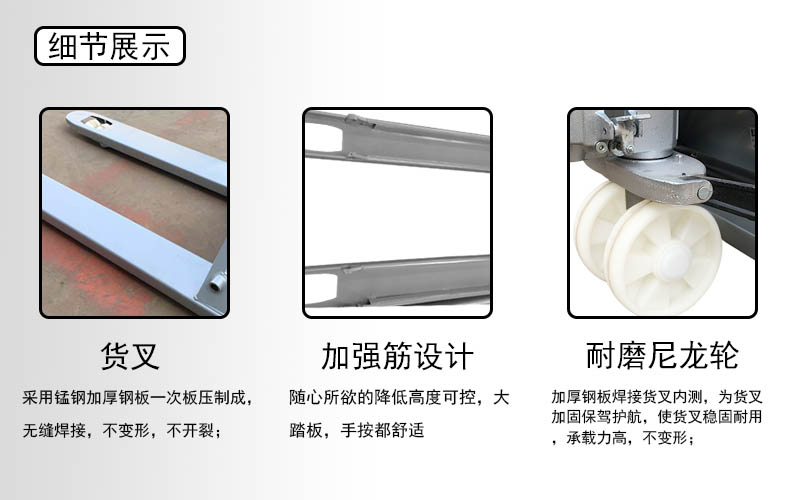 3t手動搬運車車身采用三菱全自動機器人焊接,位置準(zhǔn)確,焊接標(biāo)準(zhǔn)化,焊口平滑美觀,焊接牢固不開裂;3t手動搬運車采用整體油缸,防漏油,免維護,內(nèi)置進口密封圈,整體閥芯等配件;3t手動搬運車加厚加筋,提高強度,確保搖臂載重不易變形。產(chǎn)品規(guī)格: