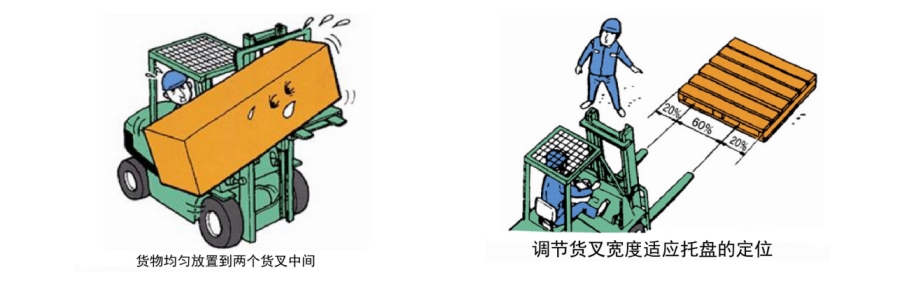 在裝載貨物時(shí),應(yīng)根據(jù)貨物大小來(lái)調(diào)整貨叉的距離,貨物的重量應(yīng)均勻分配在兩貨叉上,以免偏載或開(kāi)動(dòng)時(shí)貨物向一邊滑落。