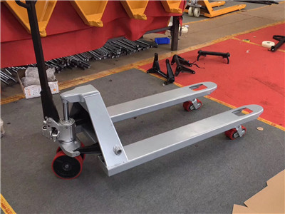 在空車運行時應(yīng)將液壓式手動叉車適當(dāng)打壓升起以免前輪軸支撐架與地面接觸磨損。