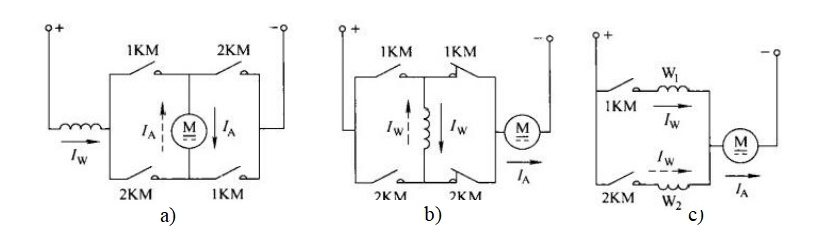 根據(jù)電磁轉(zhuǎn)矩的公式 T=KφI,我們可以發(fā)現(xiàn)通過改變電樞電流 I 或磁通 φ 的方向,可以改變電磁轉(zhuǎn)矩的方向;然而改變電樞電流和磁場方向的同時卻無法改變電磁轉(zhuǎn)矩的方向。因此,串勵電動機的反轉(zhuǎn)常常通過換向開關(guān)或其他電氣設(shè)備來實現(xiàn),將電樞或勵磁繞組反接或換接。在實際應(yīng)用中,常采用電樞反接法或勵磁繞組反接法,而不是換接勵磁繞組法。